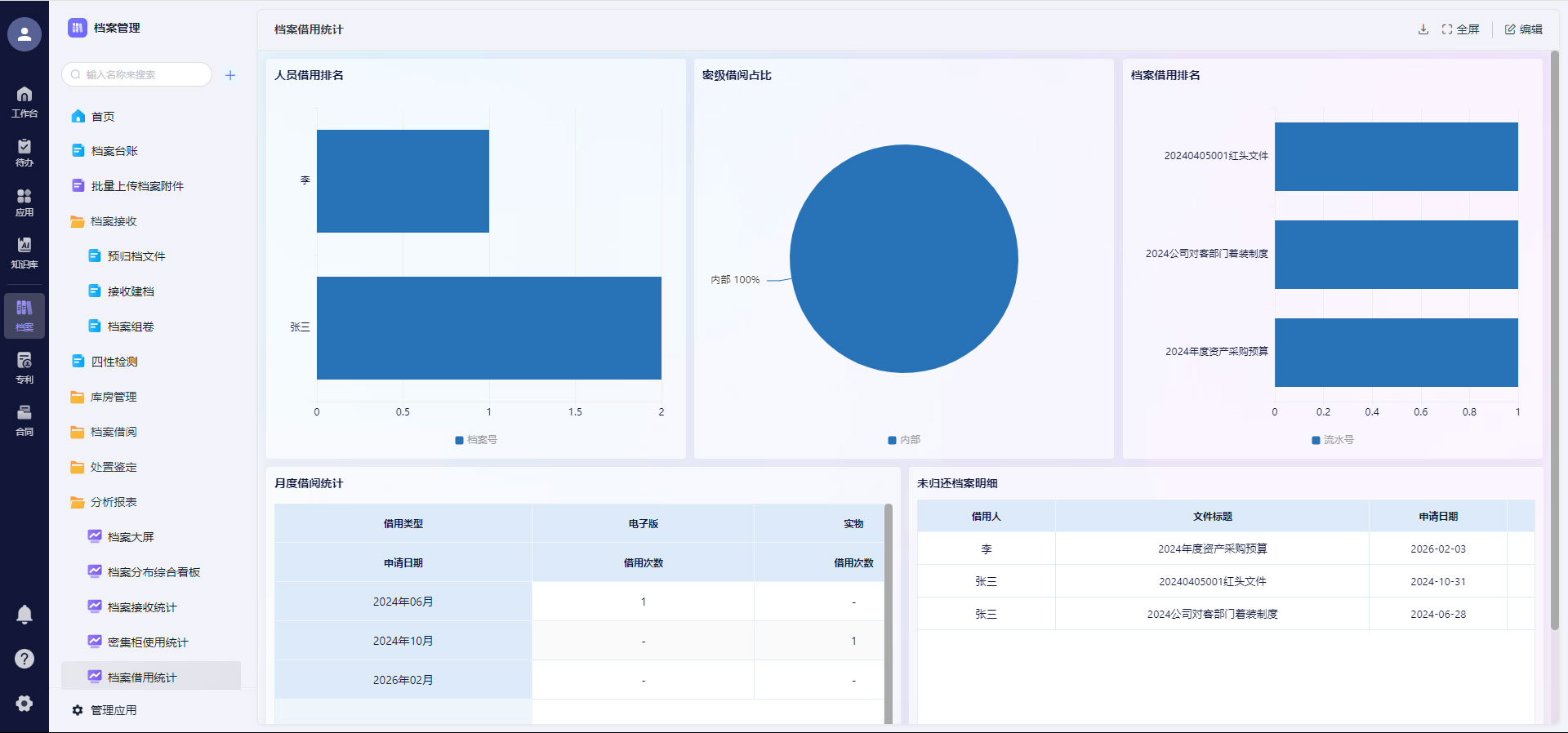 让档案数据“说话”!自动整合档案数据,生成直观报表(合同归档量、项目完成情况等),管理层后台一目了然,助力规避决策风险、优化策略。