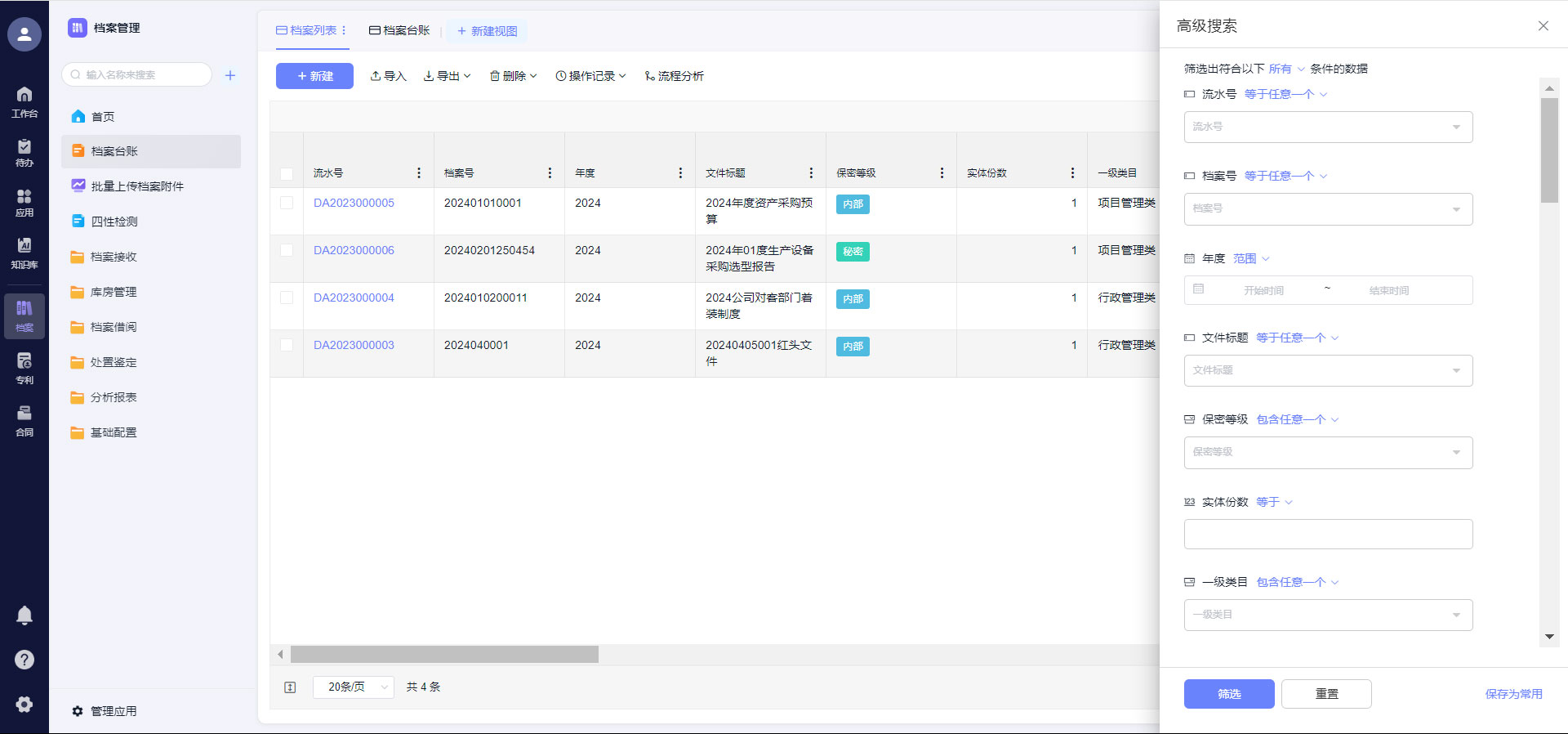 支持按部门、时间、类型、档号、责任人、关键词等多条件组合筛选。