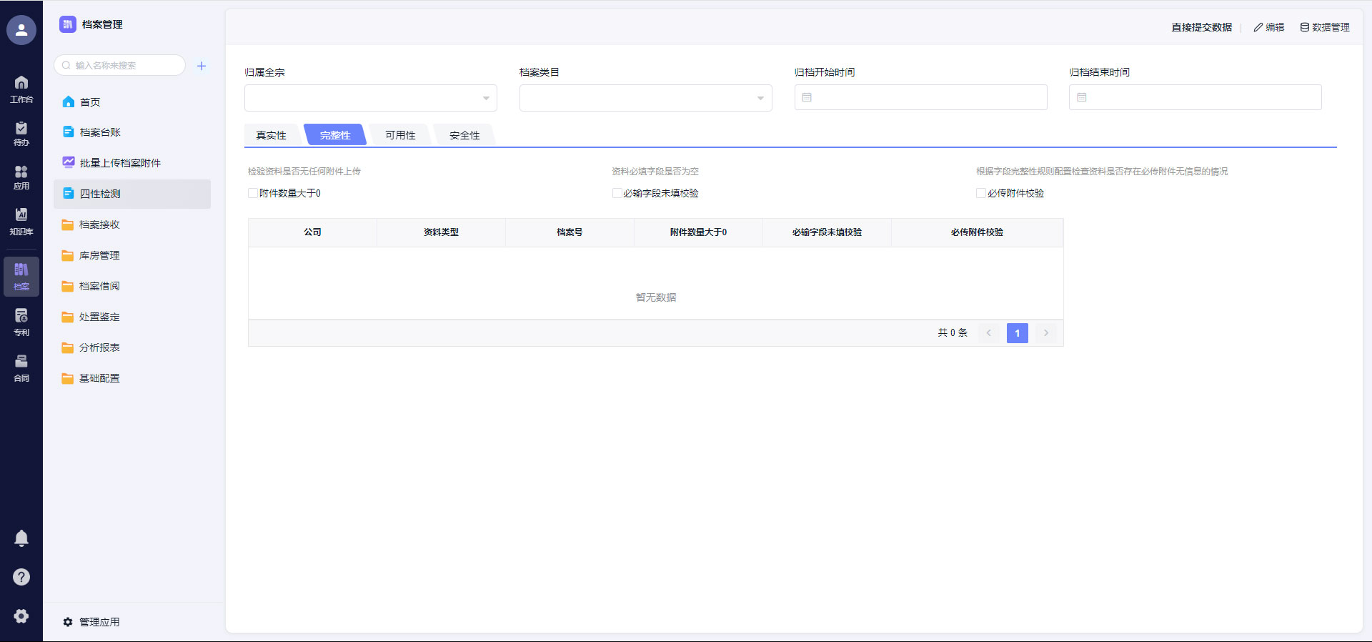 功能详解:内置智能四性检测,归档时自动校验真实性、完整性、可用性、安全性,不合规实时预警并提示问题。系统遵循最新规范,操作全程留痕,自动生成合规报告,审计时直接导出即可,不用熬夜补材料。