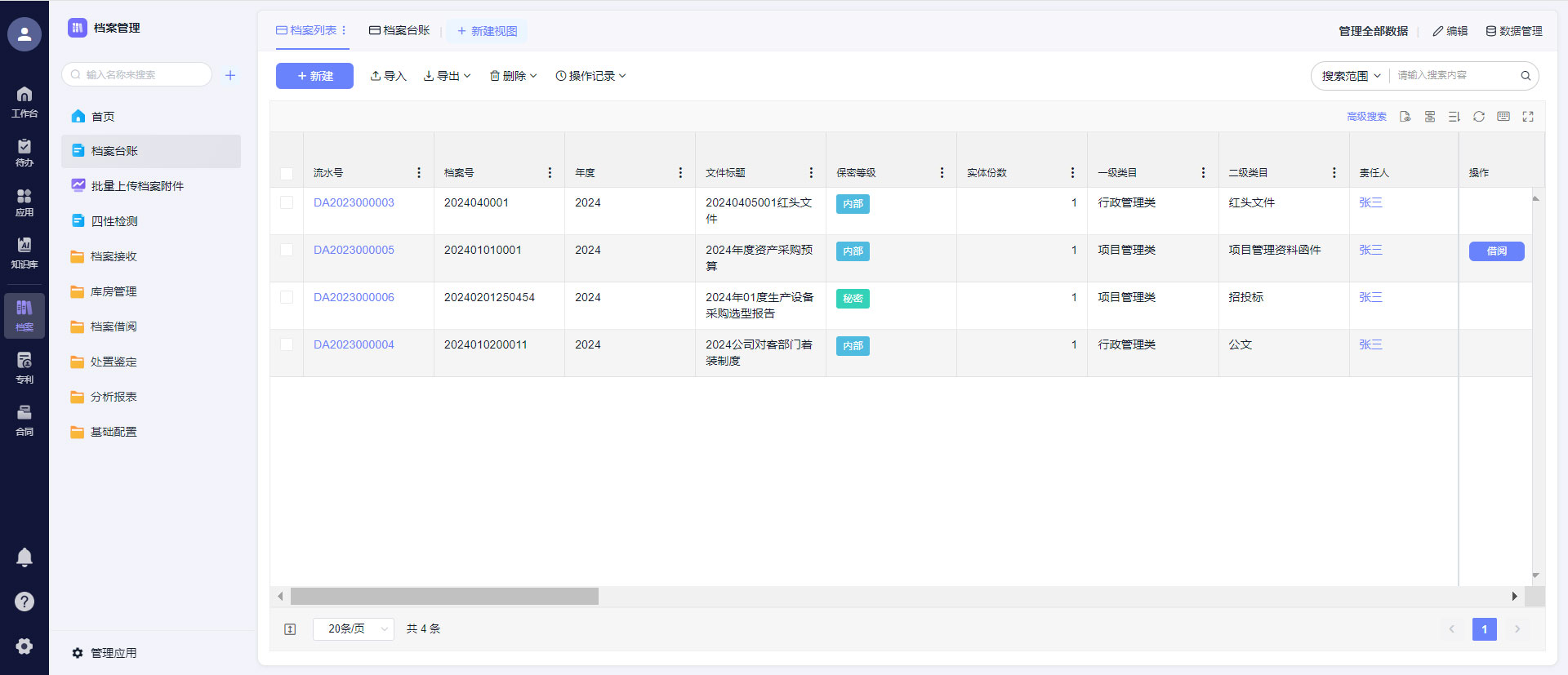 企业的档案不止一种,有文书、合同、会计、项目、人事、影像……传统管理要分开建库,特别麻烦。档案宝实现全门类一体化管理,不管是纸质档案、电子档案,还是实体档案,都能在一个平台管控。